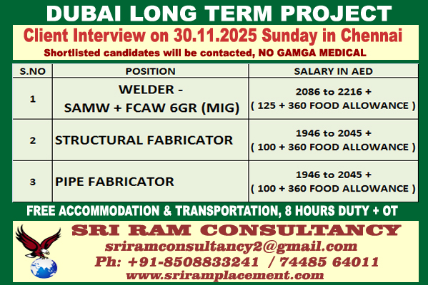 URGENT REQUIREMENT FOR DUBAI LONG TERM PROJECT .  Apply : [email protected].