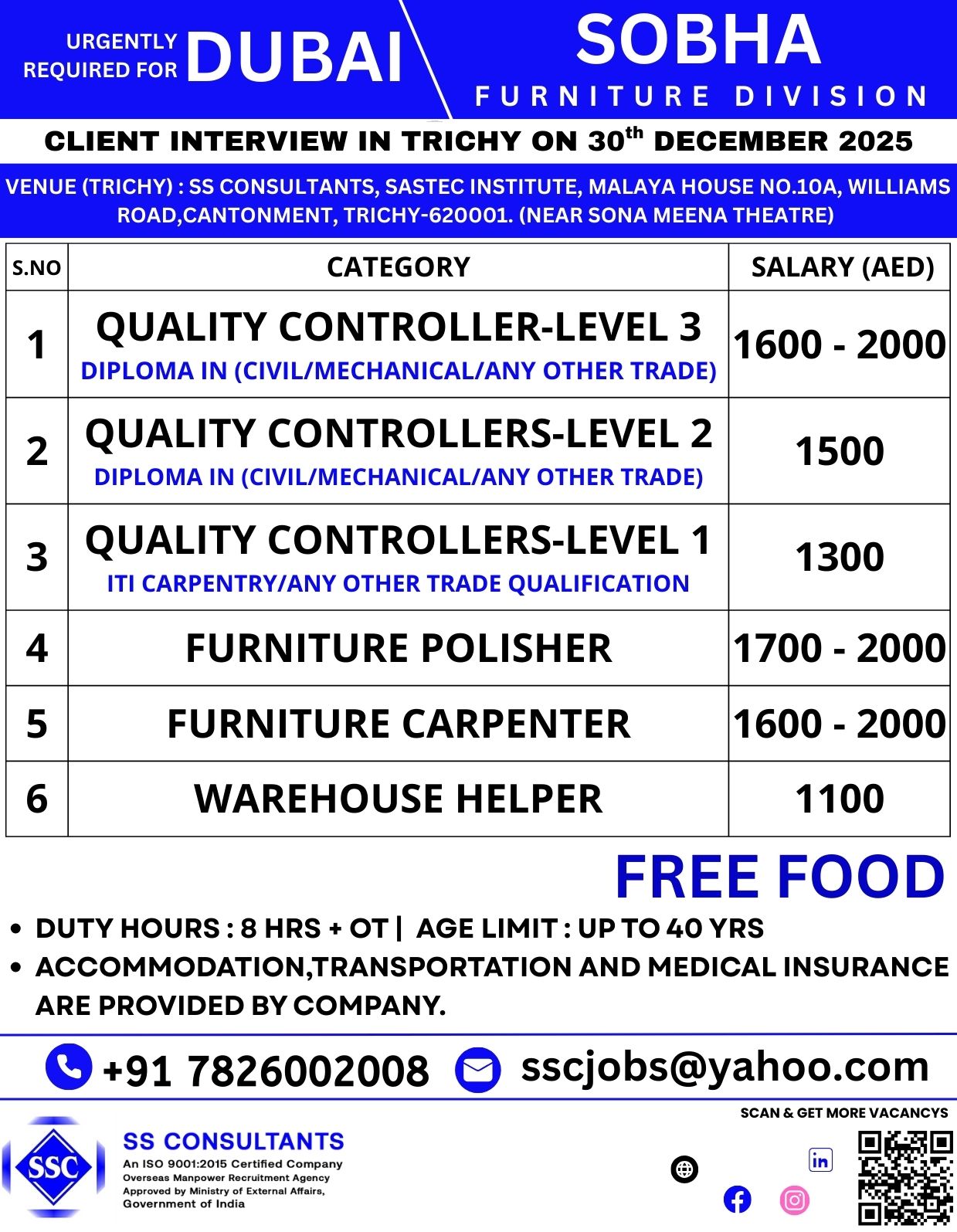 Keywords for Search: UAE Jobs, Gulf Jobs, Furniture Jobs, Carpenter Jobs UAE, Quality Controller Jobs, Warehouse Helper Jobs, Polisher Jobs, ITI Jobs, Diploma Holder Jobs, Overseas Jobs, Trichy Interview, Free Recruitment, SS Consultants, SOBHA Recruitment, MEA Approved.