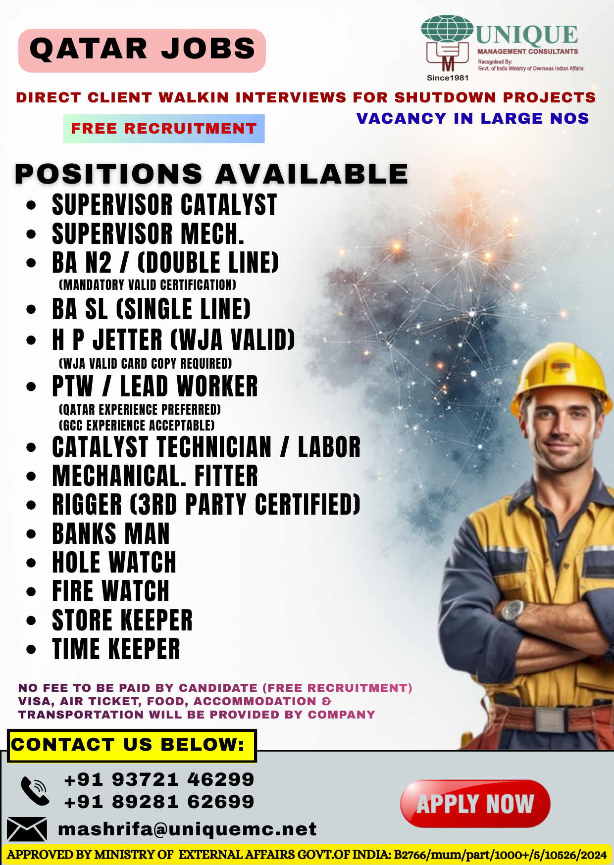 We are hiring experienced manpower for shutdown projects in Qatar.