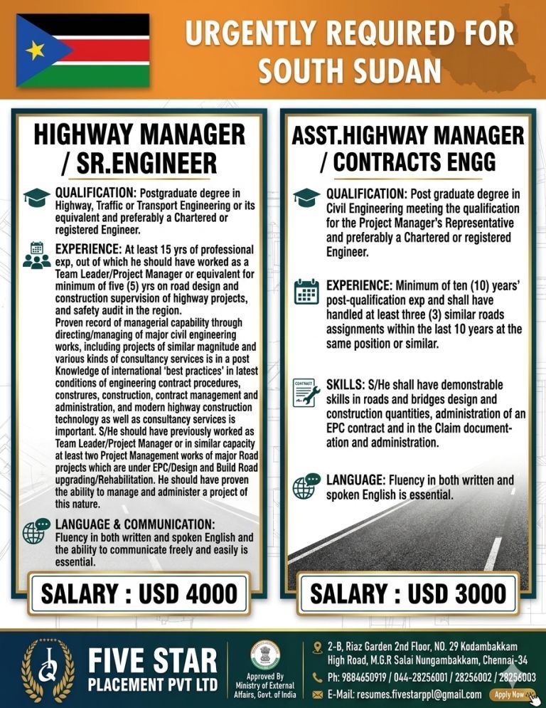 URGENT REQUIREMENT FOR SOUTH SUDAN Interested candidates can share your cv along with all credentials below Mail Id EMAIL:[email protected] CONTACT NO : 9884650919/044-28256001/28256002/28256003