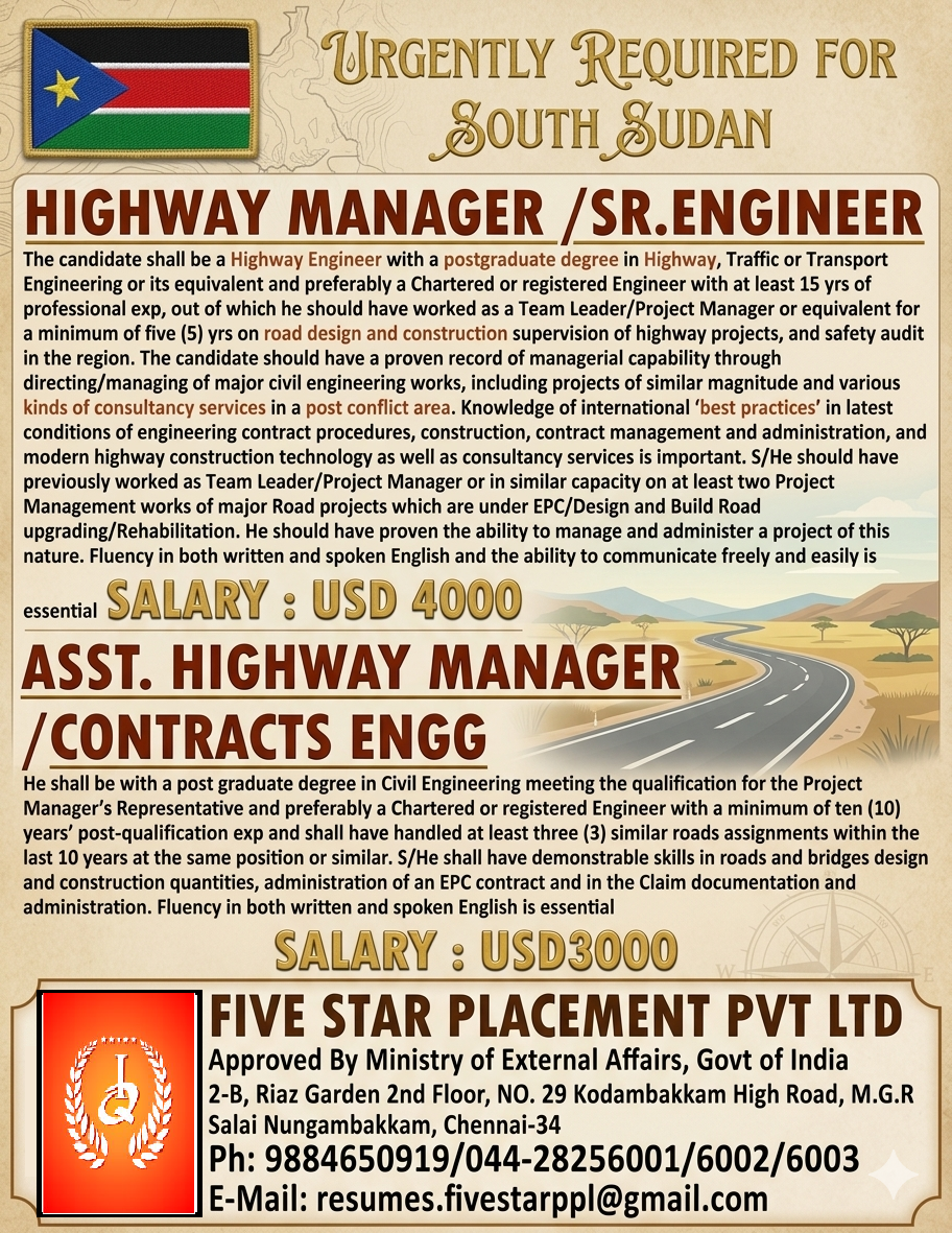URGENT REQUIREMENT FOR SOUTH SUDAN Interested candidates can share your cv along with all credentials below Mail Id EMAIL:[email protected] CONTACT NO : 9884650919/044-28256001/28256002/28256003