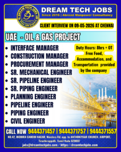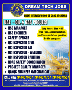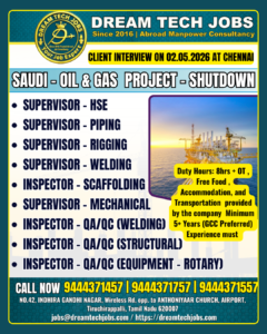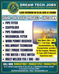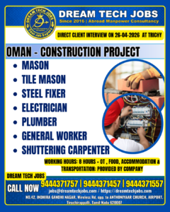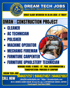 Trusted overseas job consultancy in Trichy 🇮🇳 since 2016. Hiring for Singapore, UAE, Kuwait & Gulf. Skilled & technician jobs – Oil & Gas, Shipyard, Construction. AbroadJobs