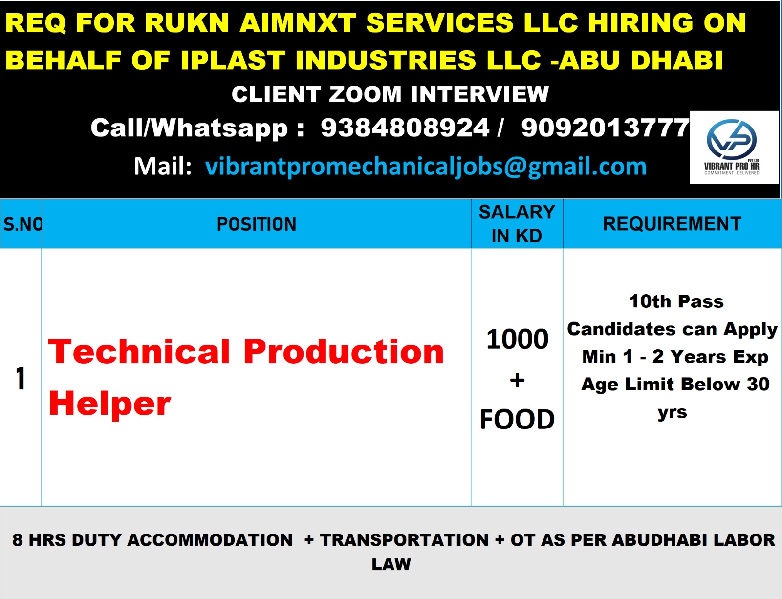 | 1 | Technical Production Helper | 1000 + FOOD | 10th Pass Candidates can Apply Min 1 – 2 Years Exp Age Limit Below 30 yrs |