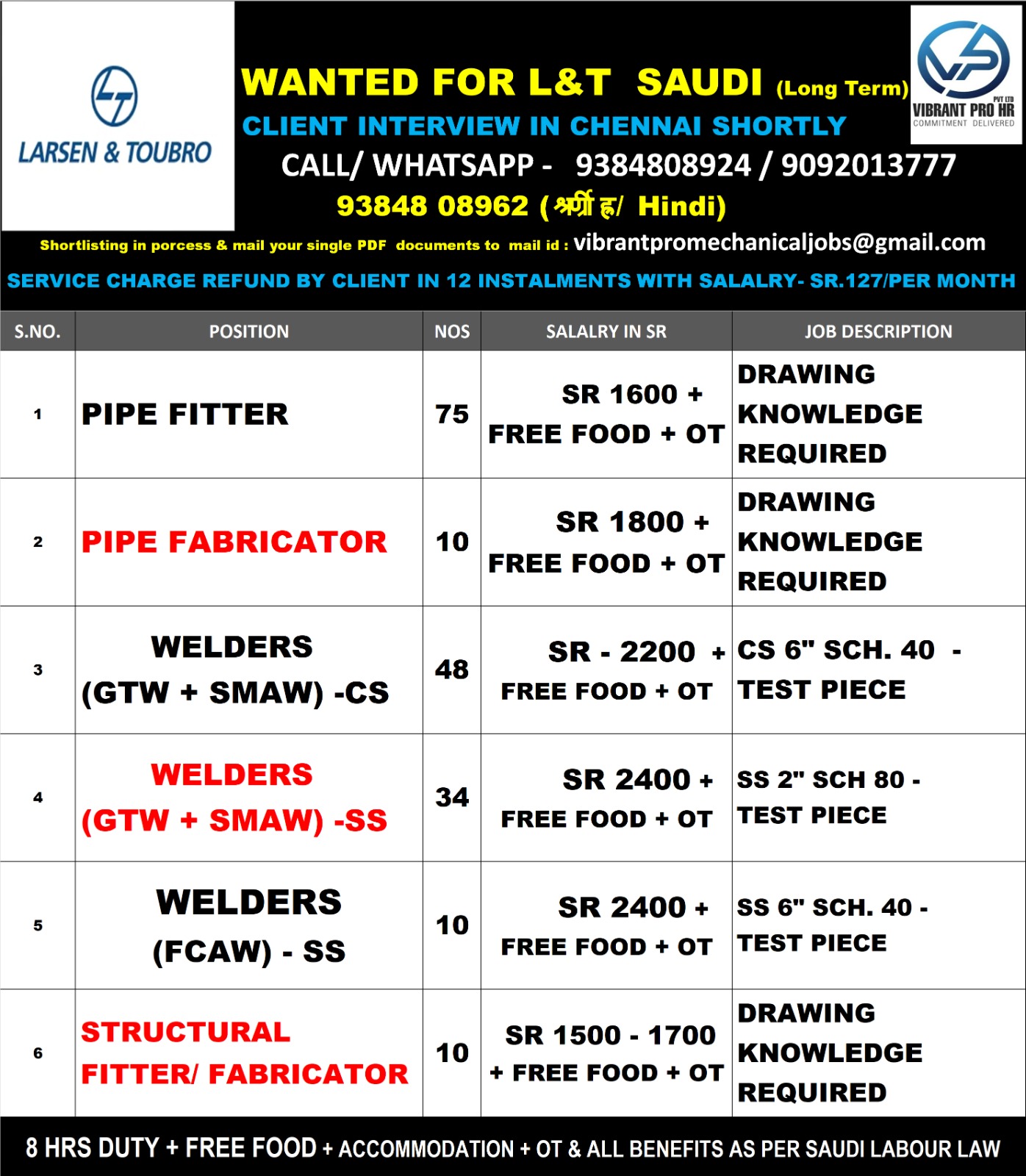 | 1 | PIPE FITTER | 75 | SR 1600 + FREE FOOD + OT | DRAWING KNOWLEDGE REQUIRED |